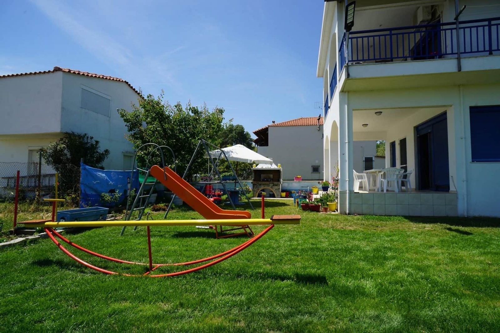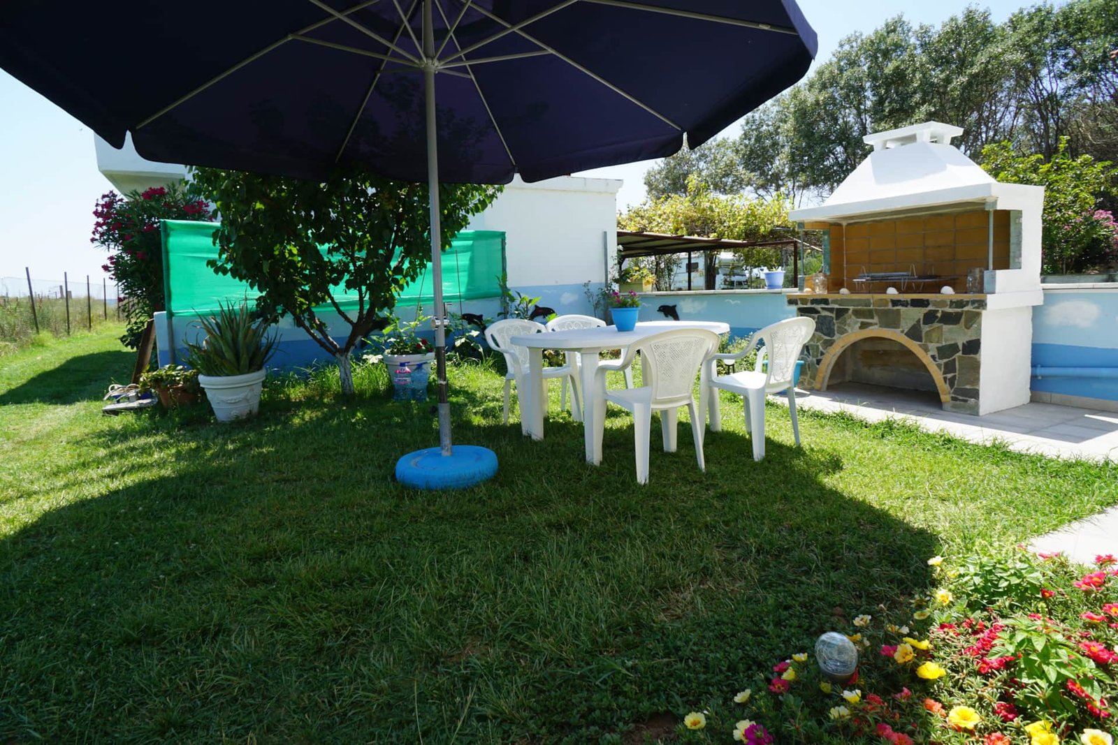 In the yard there is a stone barbecue, 2 outdoor showers, garden furniture, a large umbrella.