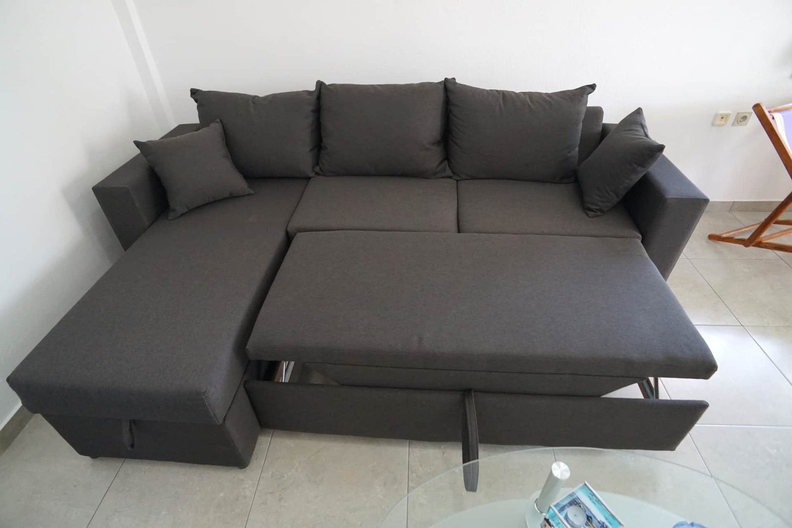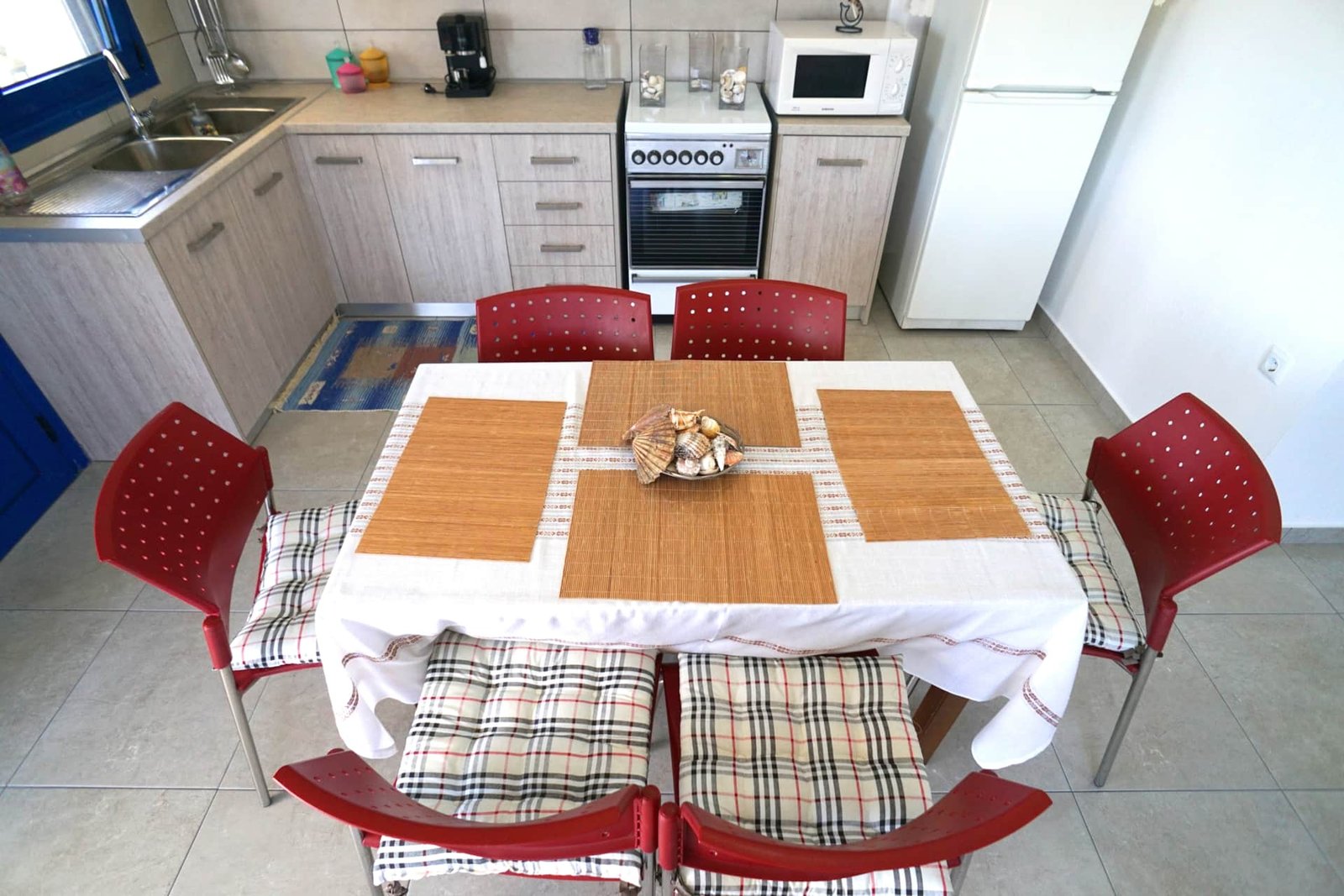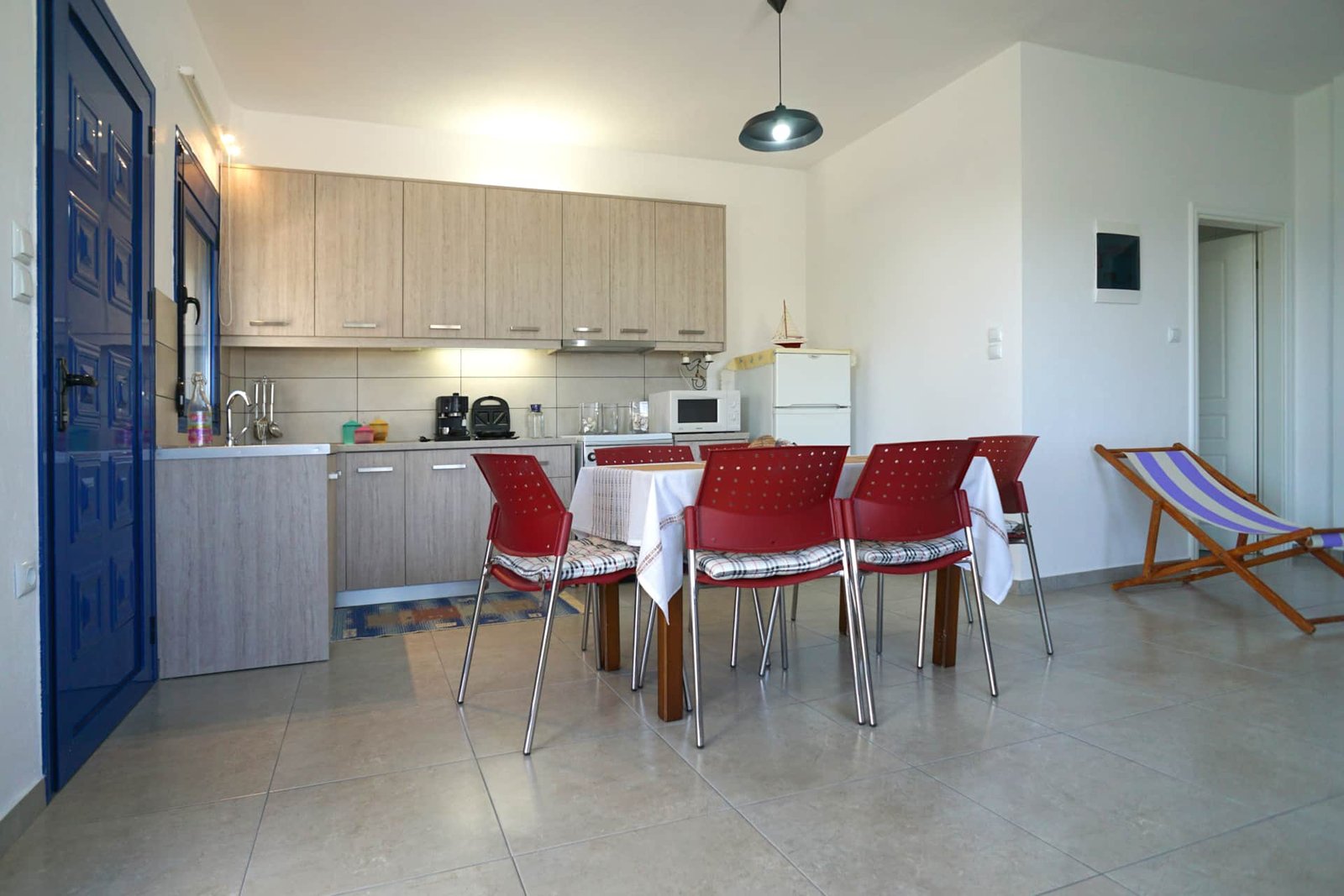 In the living room there is a pull-out double sofa-bed and another sofa. There is a fully equipped kitchen, a bathroom with a toilet and a large terrace with a table and chairs.
