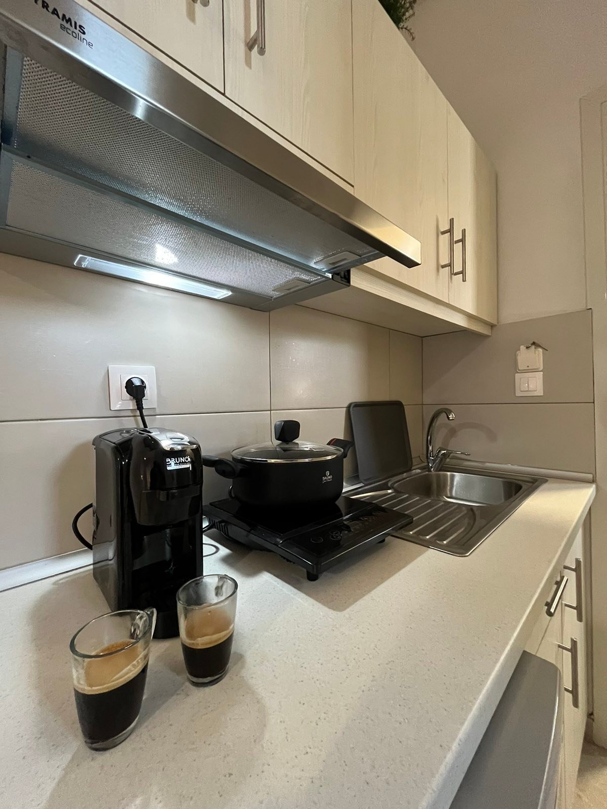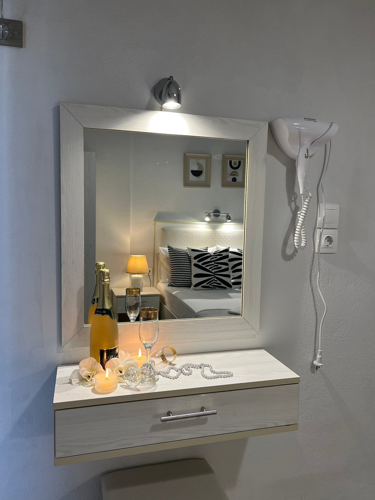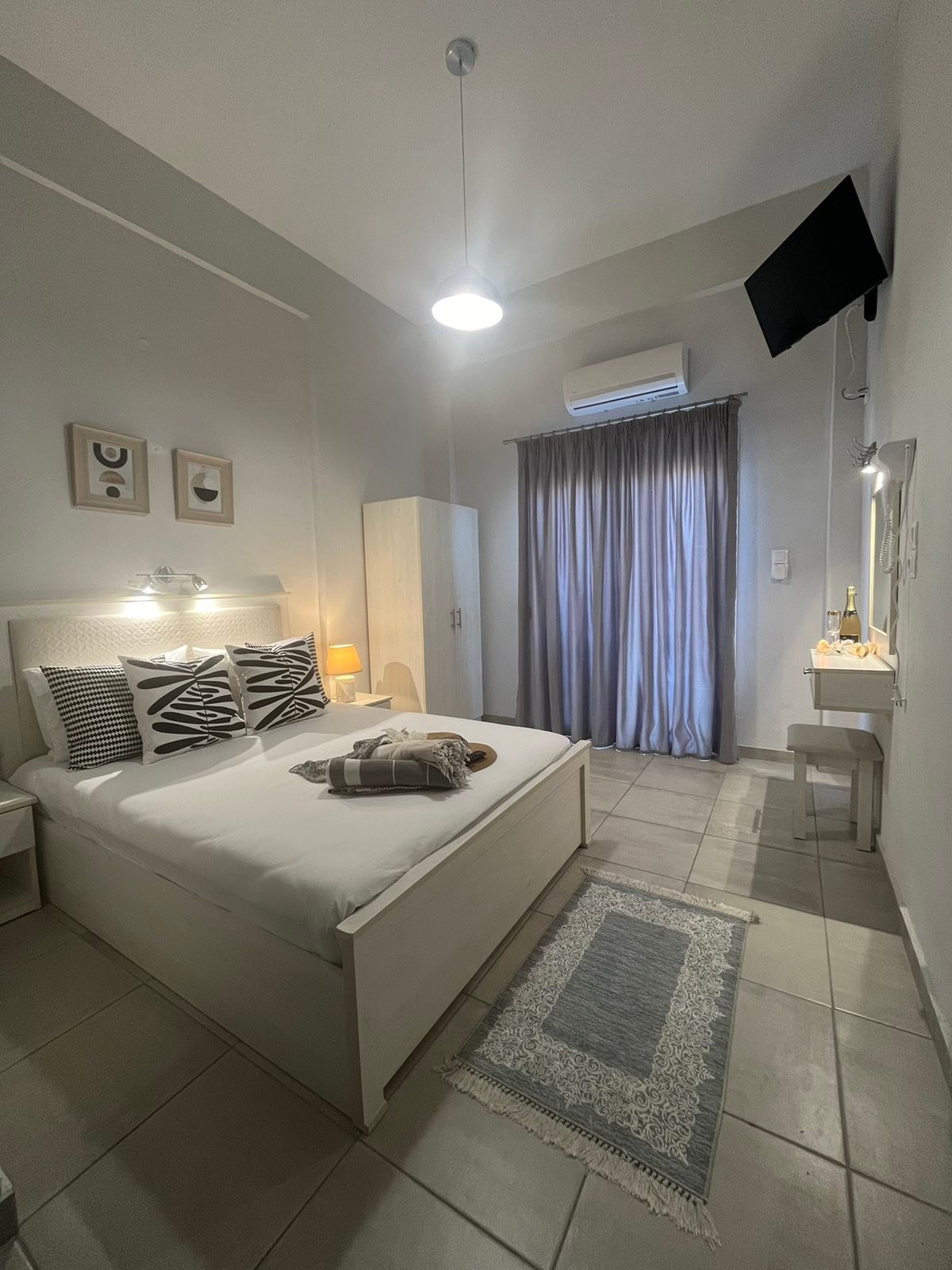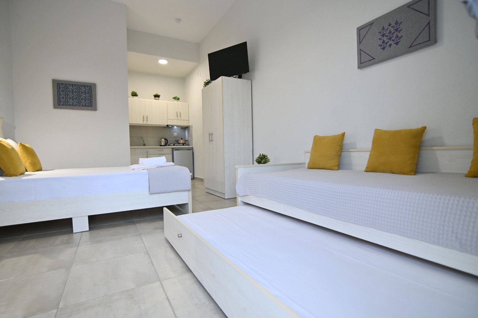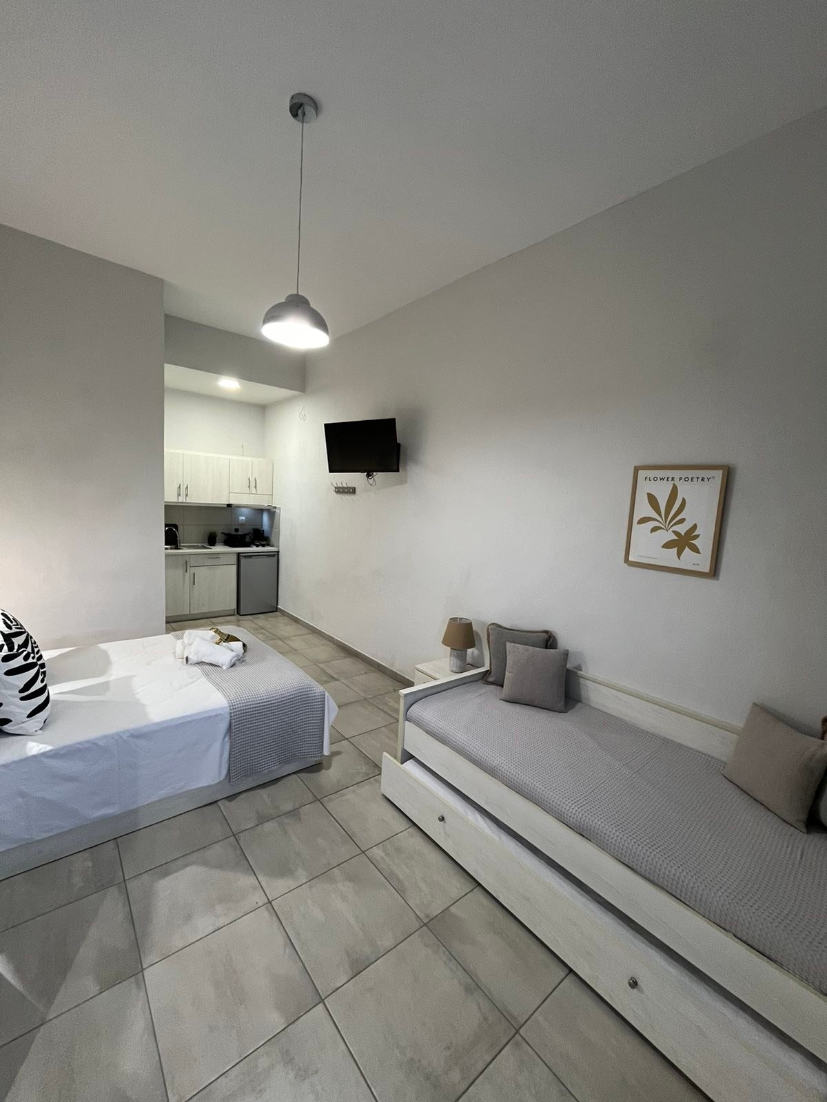 Всяко студио разполага с голямо двойно легло, а в студиата за 4 човека има допълнително единично легло тип сандвич, напълно оборудвана кухня с хладилник, телевизор с плосък екран с кабелни канали, баня с душ и безплатни тоалетни принадлежности.